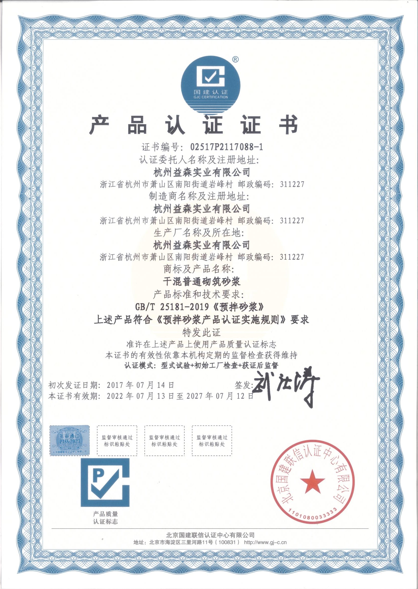 產(chǎn)品認(rèn)證證書(shū)(干混抹灰砂漿)
