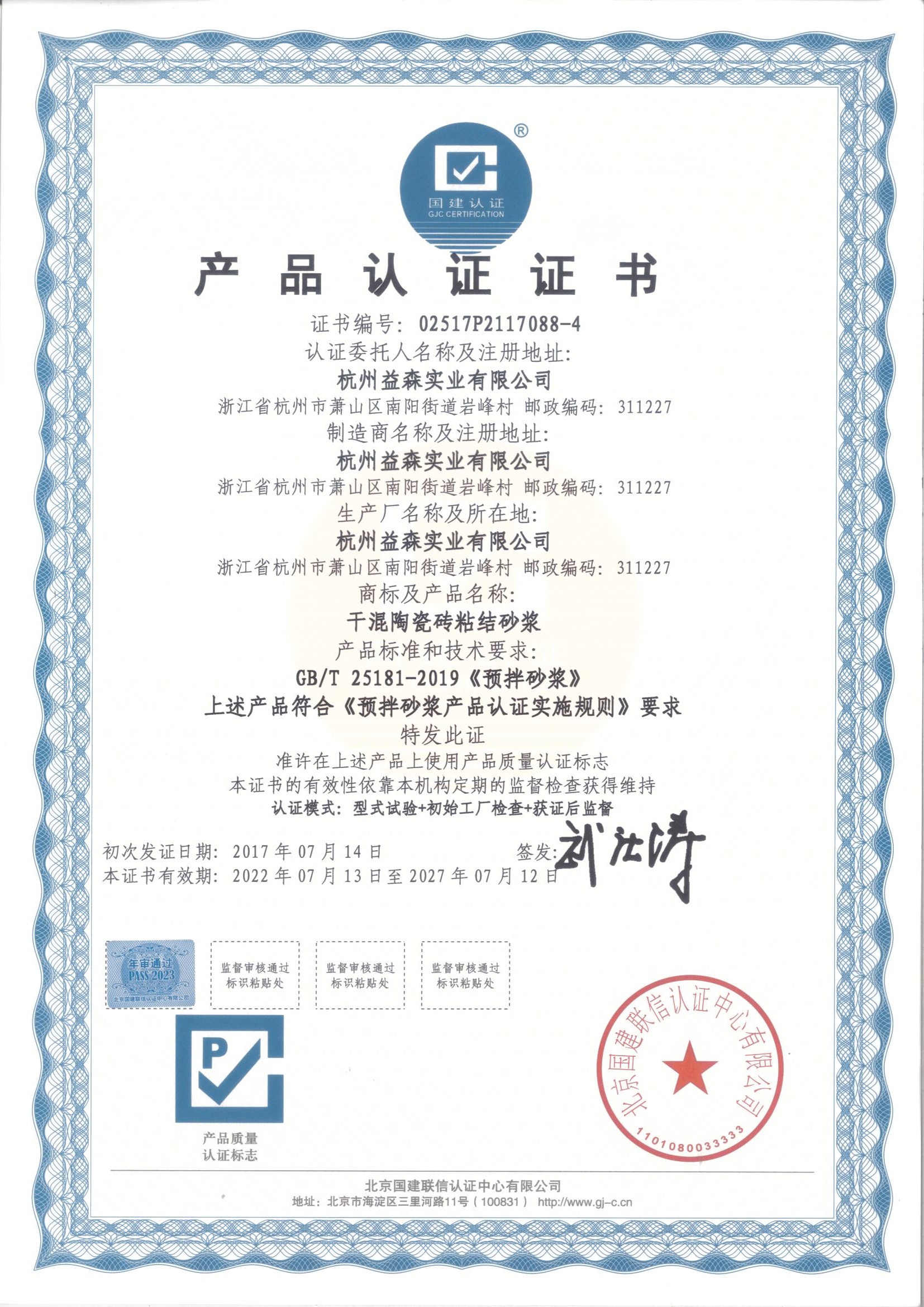 產(chǎn)品認(rèn)證證書(干混陶瓷磚粘結(jié)砂漿)